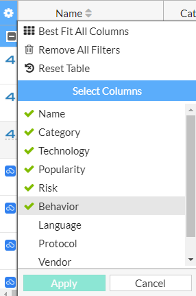 1. In the Application Signature page, ensure the Behavior column is displayed. If necessary, add the Behavior column.