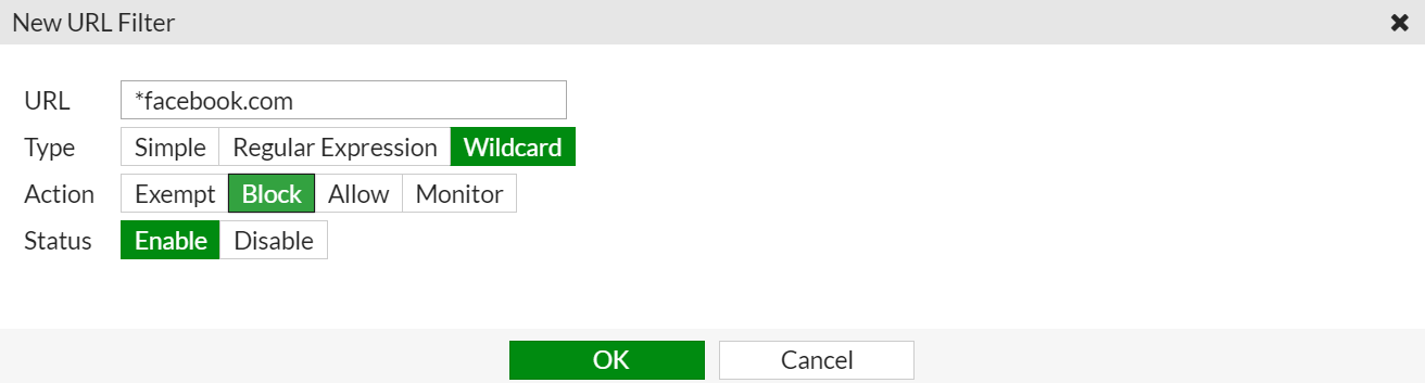 In the following example, a URL filter will be created to block the facebook.com URL using a wildcard.