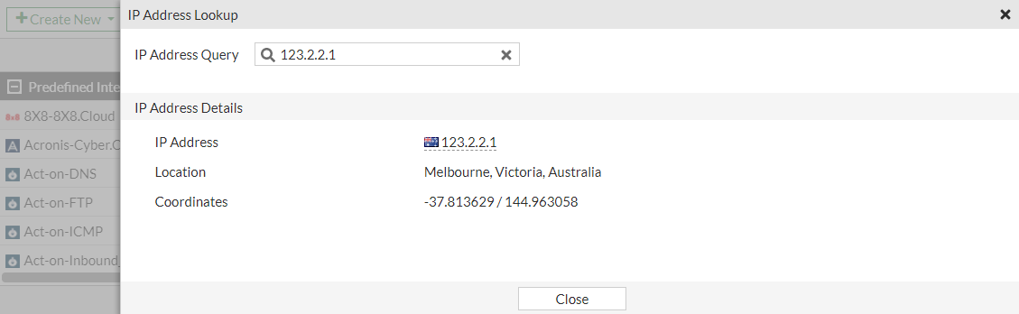 The IP Address Lookup button allows users to look up IP address information from the Internet Service Database and GeoIP Database. Returned IP address information includes the reverse IP address/domain lookup, location, reputation, and other internet service information.