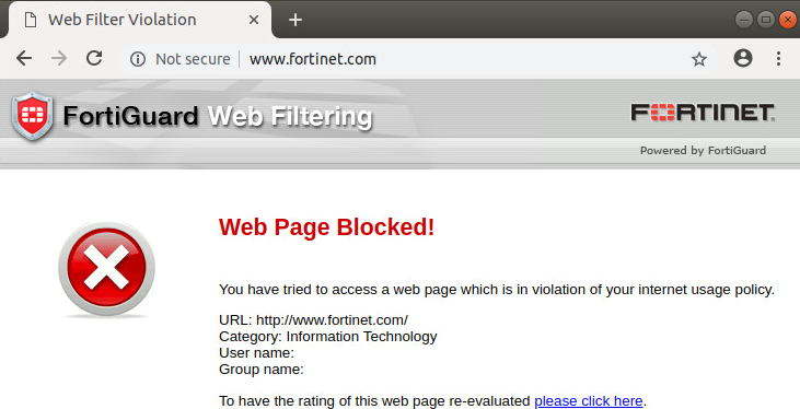- Go to a website that belongs to the blocked category, such as www.fortinet.com.