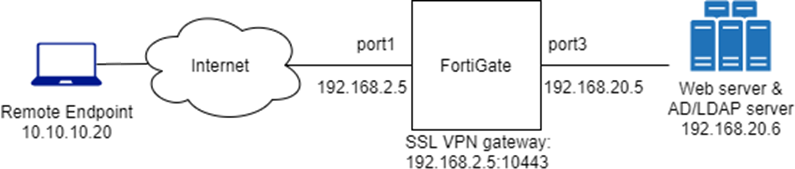Remote users that are in the ALLOWED-VPN active directory group have access to a specific web server when they connect through the SSL VPN tunnel. The FortiGate enables split tunneling to the web server so that only traffic to that destination is routed through the tunnel. The web server hosts internal websites that are only accessible by employees.