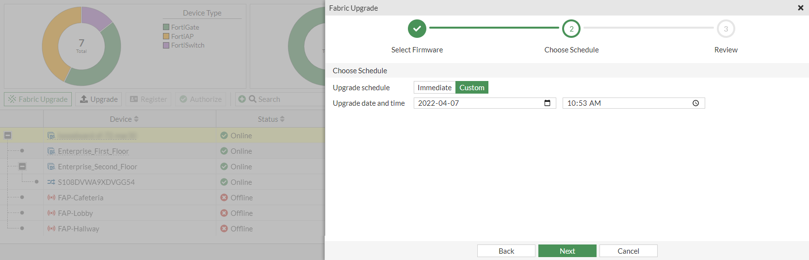 - Click Next and review the update schedule. For FortiSwitch, a message appears because no firmware upgrade is currently available.