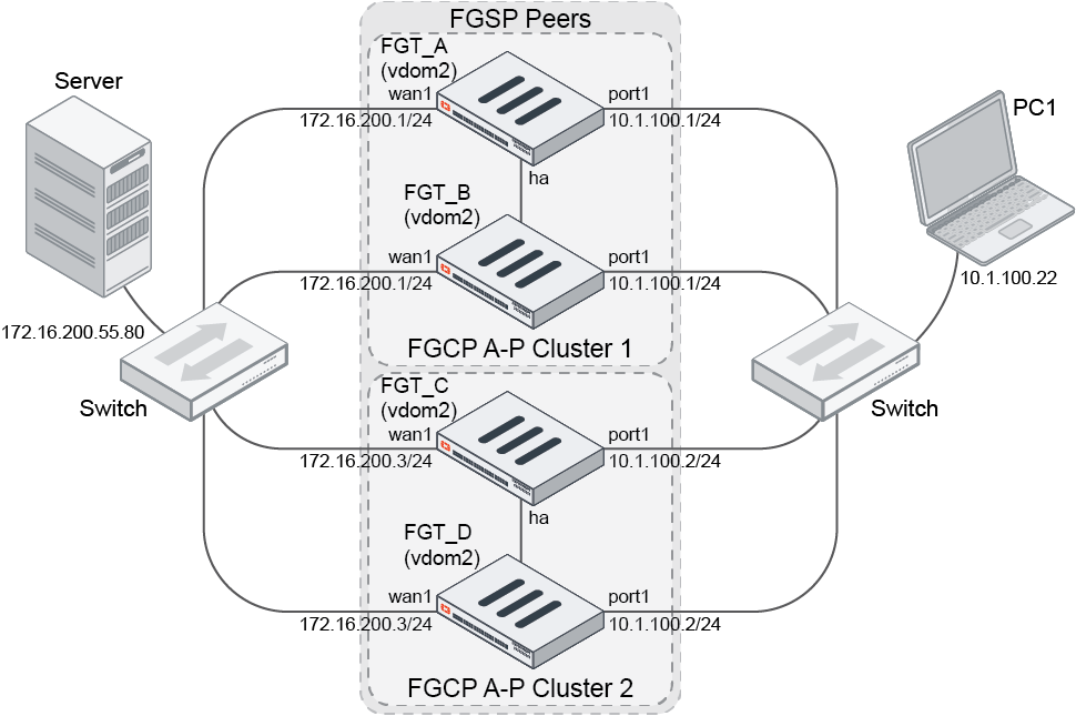 When the session synchronization filter is applied on FGSP, the filter will only affect sessions synchronized between the FGSP peers. When virtual clustering is used, sessions synchronized between each virtual cluster can also be synchronized to FGSP peers. All peers' syncvd must be in the same HA virtual cluster.