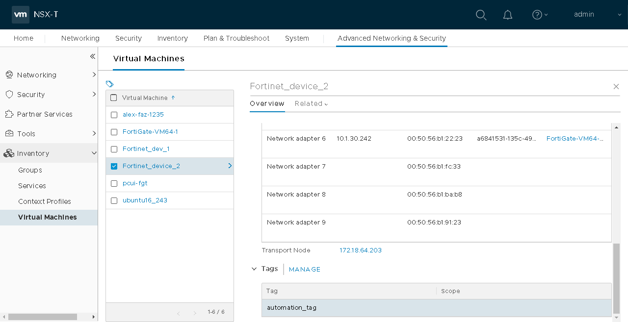 root@pc56:/home# curl -k -X POST -H 'Authorization: Bearer 3fdxNG08mgNg0fh4NQ51g1NQ1QHcxx' --data '{ "srcip": "10.1.30.242"}' https://172.16.116.230/api/v2/monitor/system/automation-stitch/webhook/auto_webhook { "http_method":"POST", "status":"success", "http_status":200, "serial":"FGVM08TM20000000", "version":"v6.4.0", "build":1608 }The automation stitch is triggered and the configured tag is added to the NSX-T VM.