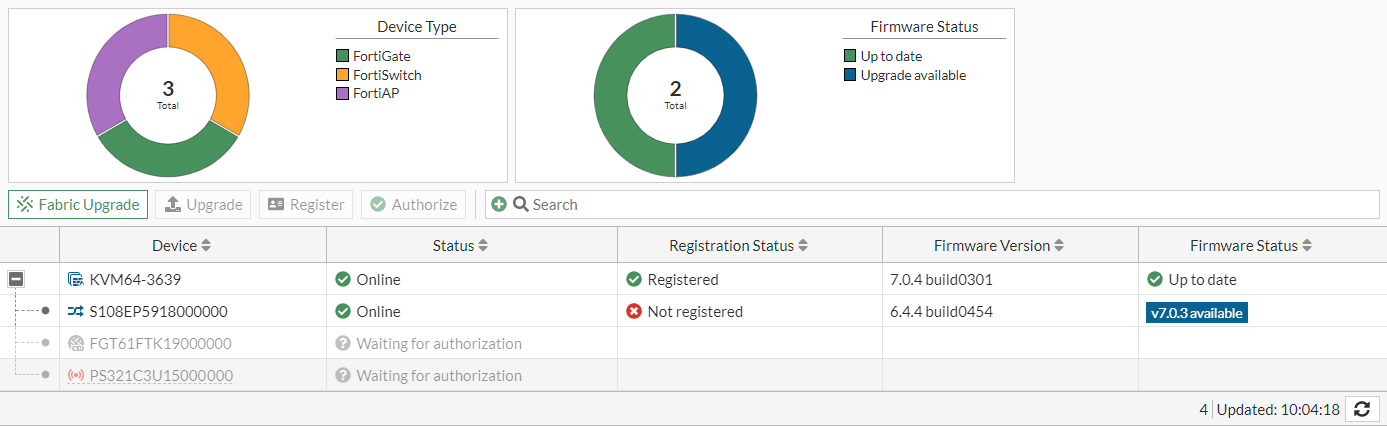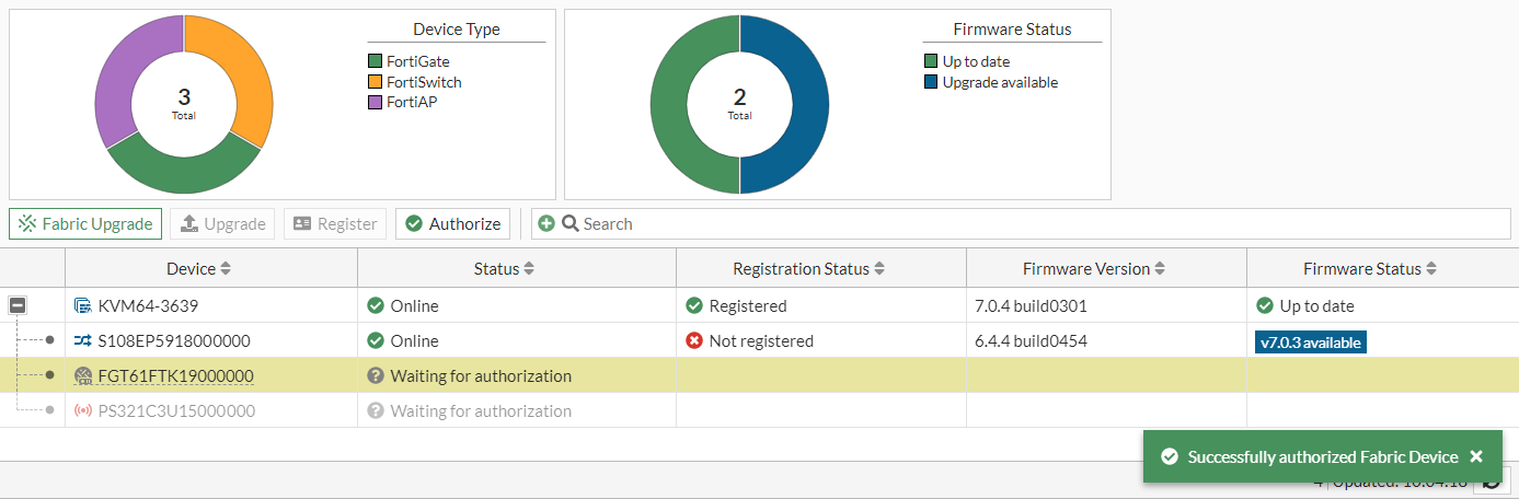 On the Fabric Management page, the unauthorized devices (a downstream FortiGate and a FortiAP) are grayed out, and their status is Waiting for authorization.