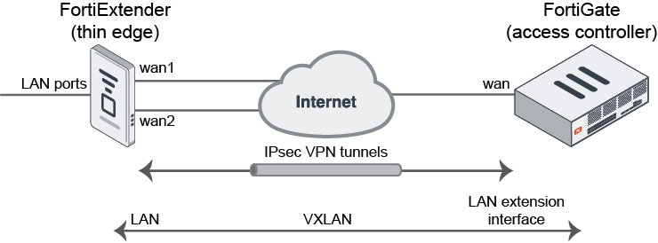 The LAN extension configuration mode allows FortiExtender to provide remote thin edge connectivity back to the FortiGate over a backhaul connection. A FortiExtender deployed at a remote location will discover the FortiGate access controller (AC) and form an IPsec tunnel (or multiple tunnels when multiple links exist on the FortiExtender) back to the FortiGate. A VXLAN is established over the IPsec tunnels to create an L2 network between the FortiGate and the network behind the remote FortiExtender.