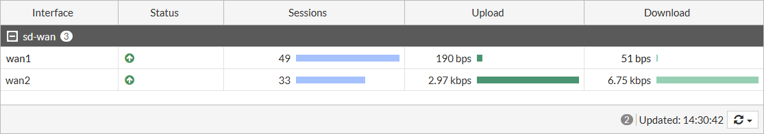 3. Go to Dashboard > Network, and expand the SD-WAN widget to see information about each interface, such as the number of sessions and the bit rate.