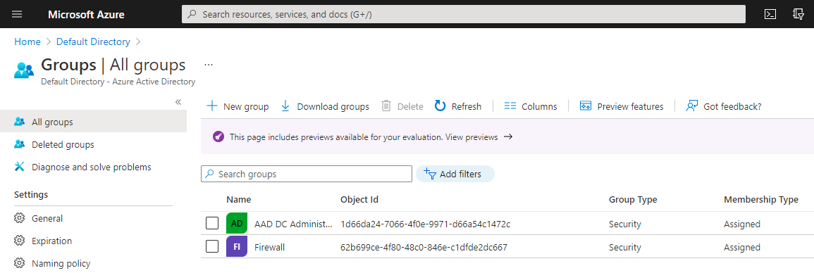 In this example environment, a user is added in the Azure AD belonging to the security group called Firewall.