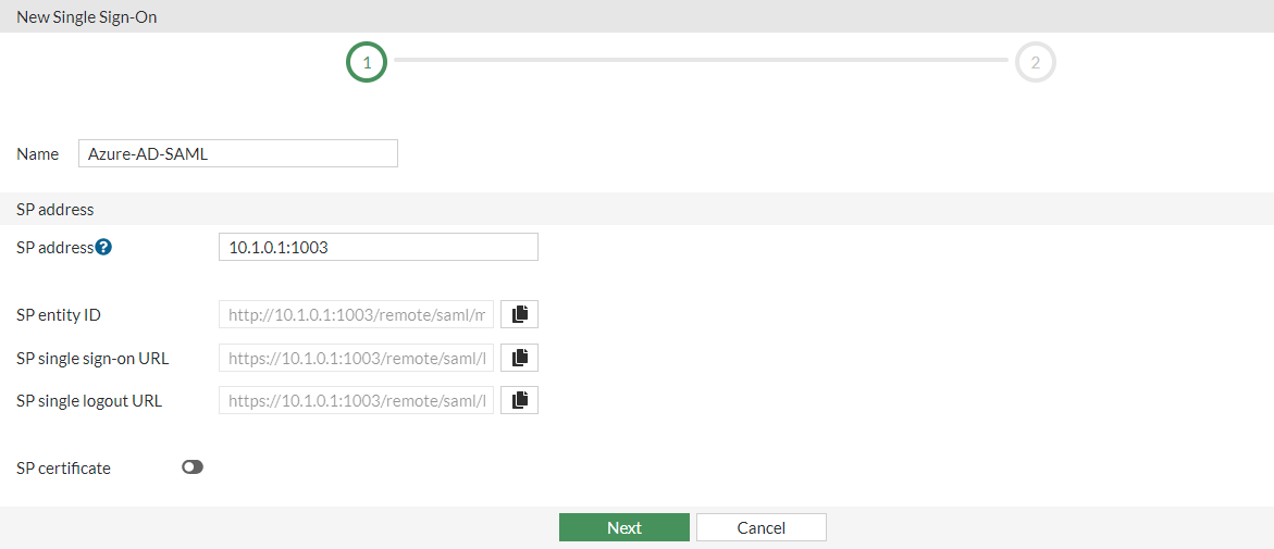 Enter the SP address, 10.1.0.1:1003. The three SP URLs are automatically populated.
