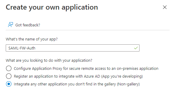 Enter a name for the application (SAML-FW-Auth) and select Integrate any other application you don't find in the gallery (Non-gallery).