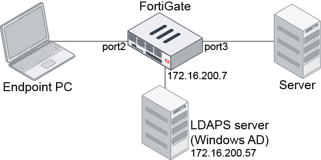 In this example, the FortiGate is configured as an explicit web proxy. It connects to the Windows AD server through LDAPS, where the Windows server requires a client certificate to connect. The client certificate is configured in the CLI.