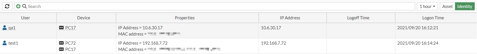 - Click Identity to view information by user. The default columns are User, Device, and Properties. The optional columns are IP Address, Logoff Time, and Logon Time.