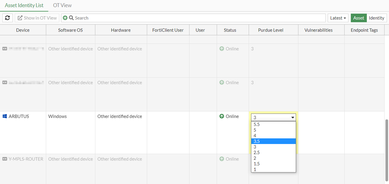 FortiGates and managed FortiSwitches are statically assigned Purdue Level 2 and cannot be changed. Other detected devices are assigned Purdue Level 3 by default and can be changed (except to level S, 0, or external).