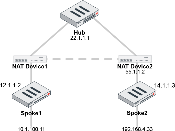 In the following example, device 10.1.100.11 behind Spoke1 needs to reach device 192.168.4.33 behind Spoke2. Spoke1 and Spoke2 are behind NAT devices and have established IPsec tunnels to the Hub. The hole punching creates a shortcut between Spoke1 and Spoke2 that bypasses the Hub.