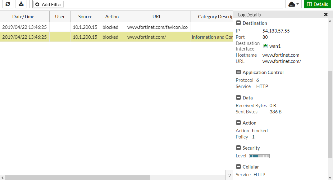 # execute log filter category utm-webfilter # execute log display 1: date=2019-04-22 time=13:46:25 logid="0316013056" type="utm" subtype="webfilter" eventtype="ftgd_blk" level="warning" vd="vdom1" eventtime=1555965984972459609 policyid=1 sessionid=659263 srcip=10.1.200.15 srcport=49234 srcintf="wan2" srcintfrole="wan" dstip=54.183.57.55 dstport=80 dstintf="wan1" dstintfrole="wan" proto=6 service="HTTP" hostname="www.fortinet.com" profile="webfilter" action="blocked" reqtype="direct" url="/" sentbyte=386 rcvdbyte=0 direction="outgoing" msg="URL belongs to a denied category in policy" method="domain" cat=52 catdesc="Information Technology"