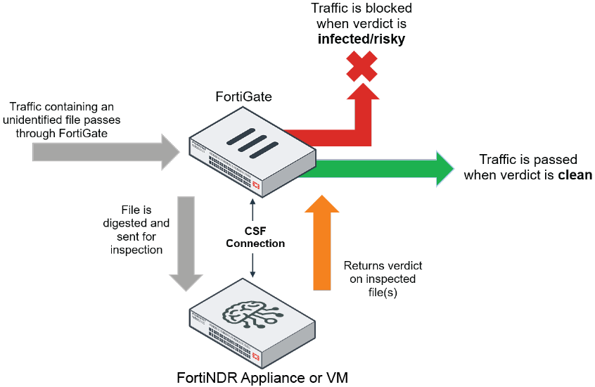- FortiNDR inline inspection occurs simultaneously.