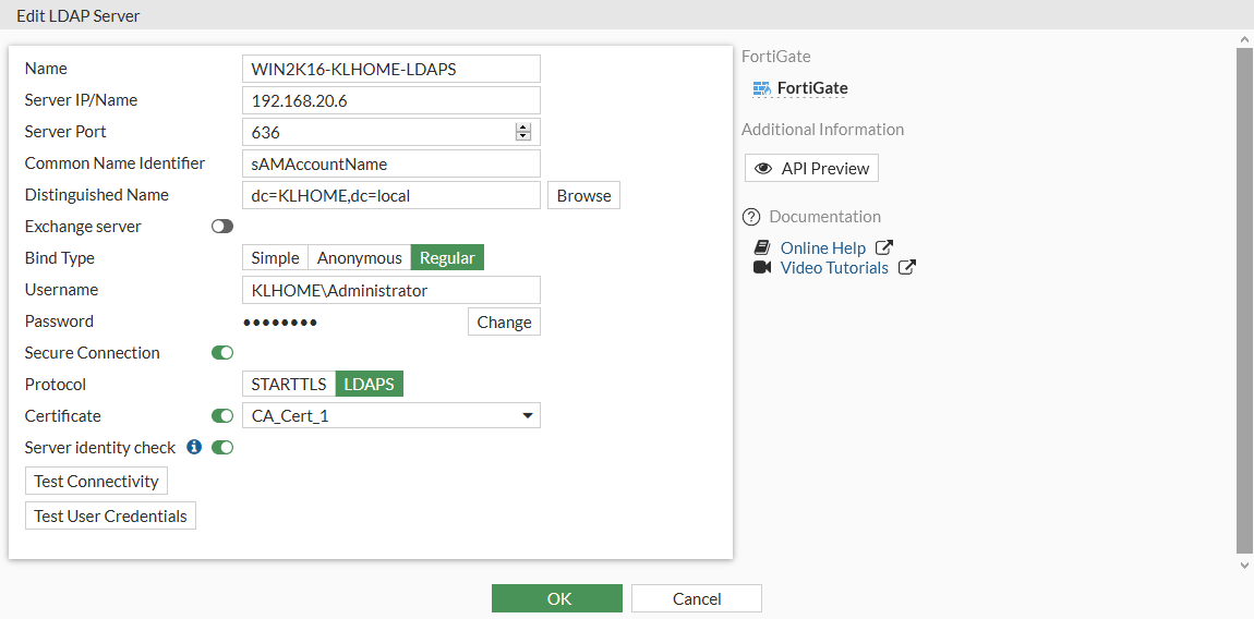 Set Remote Server to WIN2K16-KLHOME-LDAPS.