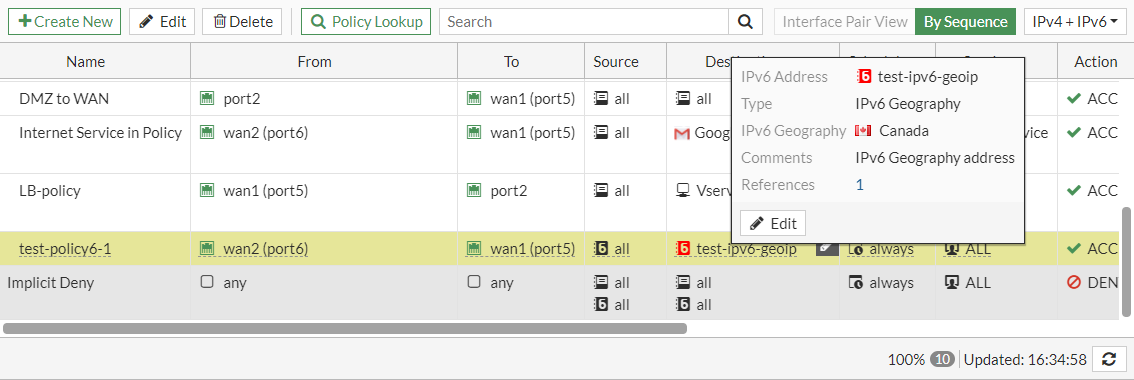 config firewall address6 edit "test-ipv6-geoip" set type geography set color 6 set comment "IPv6 Geography address" set country "CA" next end - Use the IPv6 geography-based address in a policy: