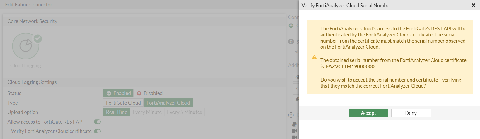 - Click OK. A prompt appears to verify the FortiAnalyzer Cloud serial number.