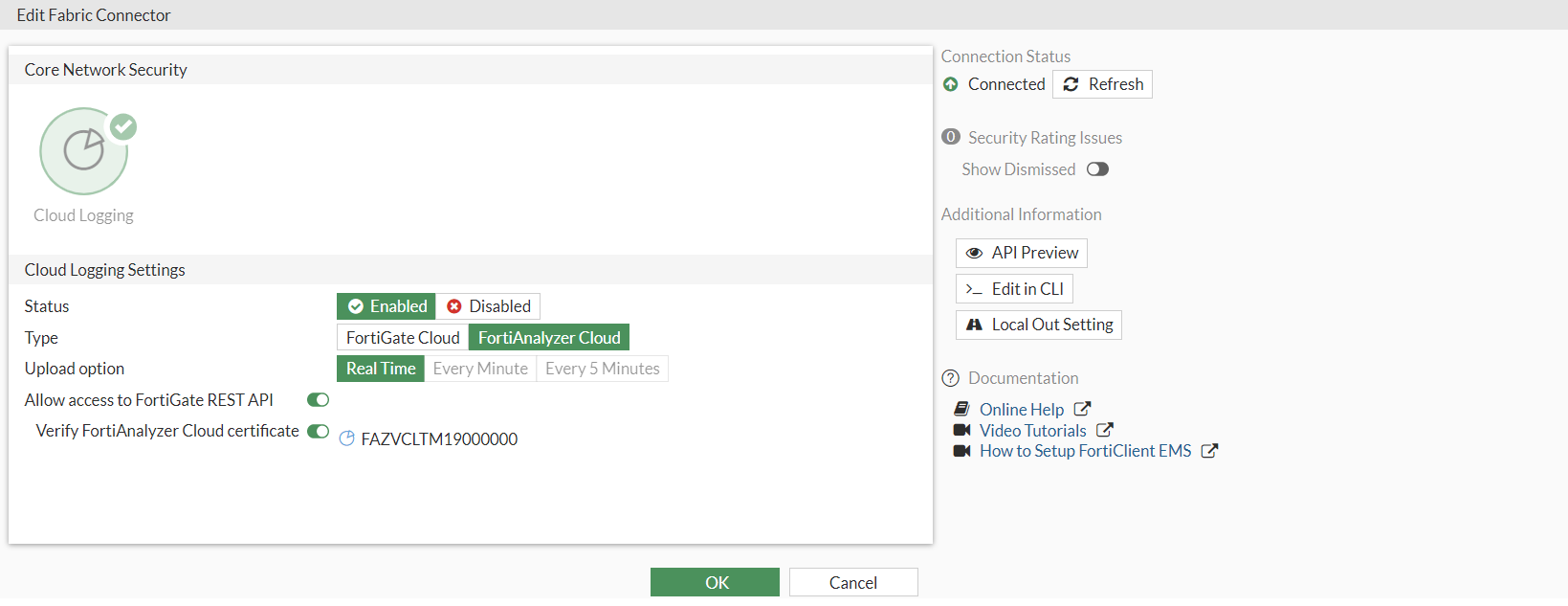 - Go to Security Fabric > Fabric Connectors and double-click the Cloud Logging card.