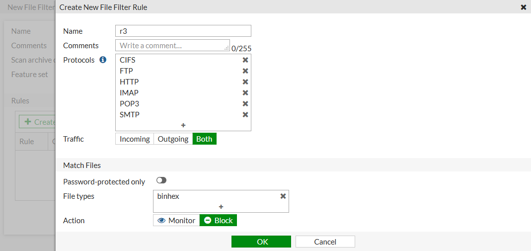 config file-filter profile edit "test" set comment '' set feature-set flow set replacemsg-group '' set log enable set scan-archive-contents enable config rules edit "r2" set comment '' set protocol http ftp smtp imap pop3 cifs set action block set direction outgoing set password-protected any set file-type "sis" "tar" "tiff" "torrent" "upx" "uue" "wav" "wma" "xar" "xz" "zip" next edit "r1" set comment '' set protocol http ftp smtp imap pop3 cifs set action log-only set direction any set password-protected any set file-type ".net" "7z" "activemime" "arj" "aspack" "avi" "base64" "bat" "binhex" "bmp" "bzip" "bzip2" next edit "r3" set comment '' set protocol http ftp smtp imap pop3 set action block set direction any set password-protected any set file-type "binhex" next end next end - Apply the filter to a policy: