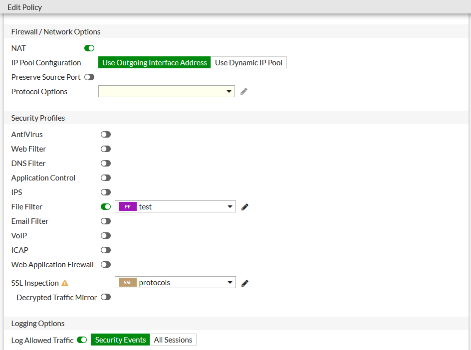 config firewall policy edit 1 set name "filefilter-policy" set srcintf "port10" set dstintf "port9" set srcaddr "all" set dstaddr "all" set srcaddr6 "all" set dstaddr6 "all" set action accept set schedule "always" set service "ALL" set utm-status enable set profile-protocol-options "protocol" set ssl-ssh-profile "protocols" set file-filter-profile "test" set auto-asic-offload disable set np-acceleration disable set nat enable next end