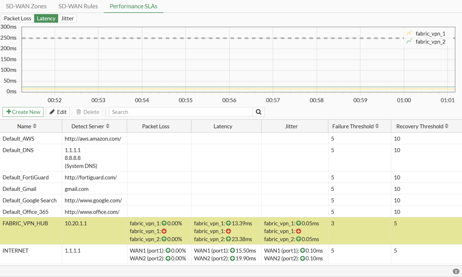 - Verify that the performance SLA is automatically created for the hub FortiGate. There is a new entry (FABRIC_VPN_HUB).
