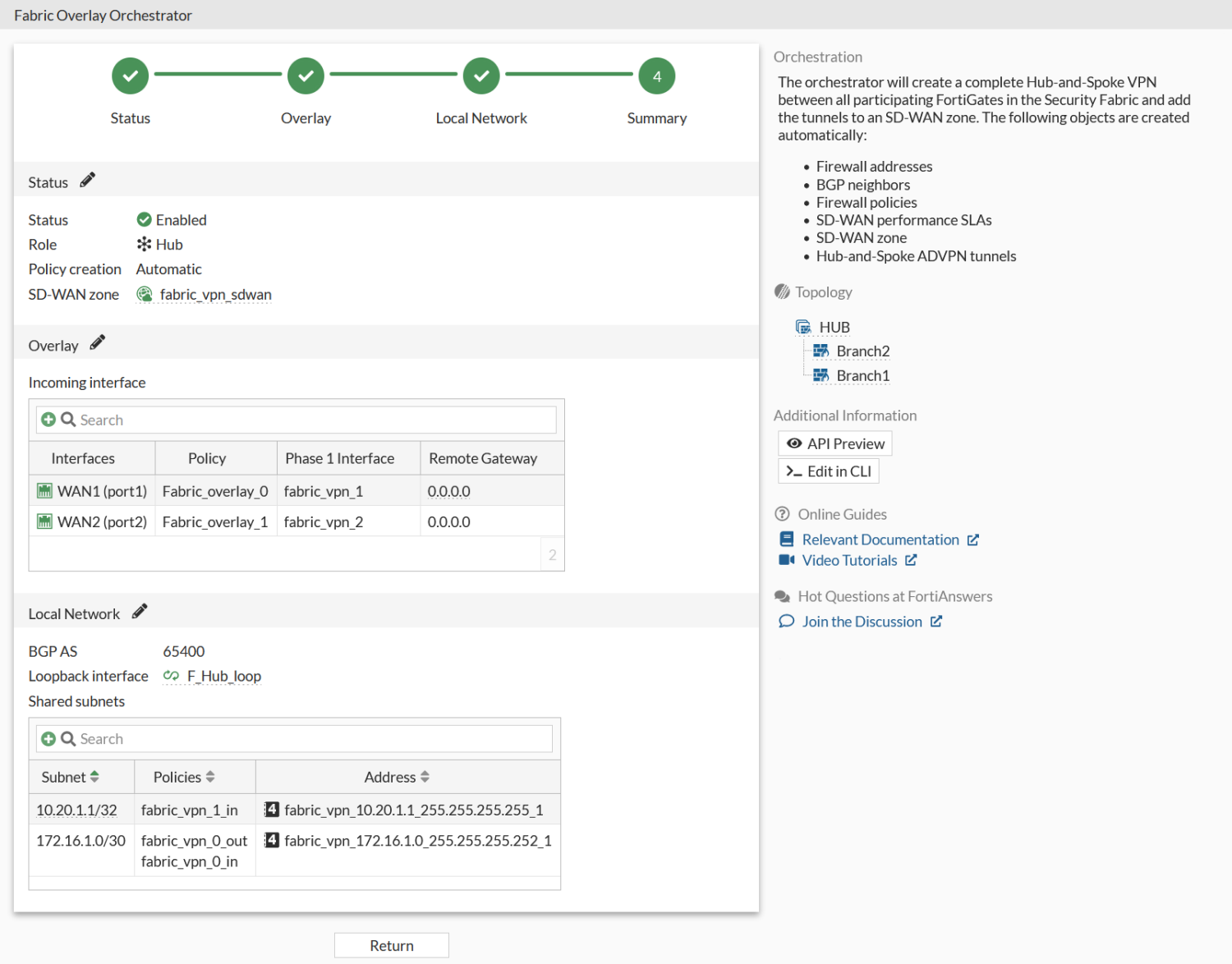Click Next. As the downstream FortiGate updates, a Configuring spoke Fabric VPN from root FortiGate message appears The Summary page appears once the update is complete.