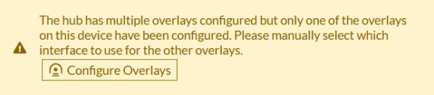 A hub typically includes two incoming interfaces, but additional interfaces can be configured if needed. On downstream devices, the following warning is displayed on the Fabric Overlay Orchestrator page that The hub has multiple overlays configured but only one of the overlays on this device have been configured. Please manually select which interface to use for the other overlays.