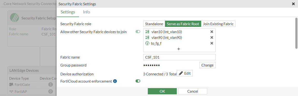 - Click OK. The FortiGate is authorized and successfully joins the Security Fabric.