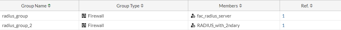 - Configure two firewall groups, one named radius_group with remote server member fac_radius_server, and one named radius_group_2 with remote server member RADIUS_with_2ndary (refer to the previous example).