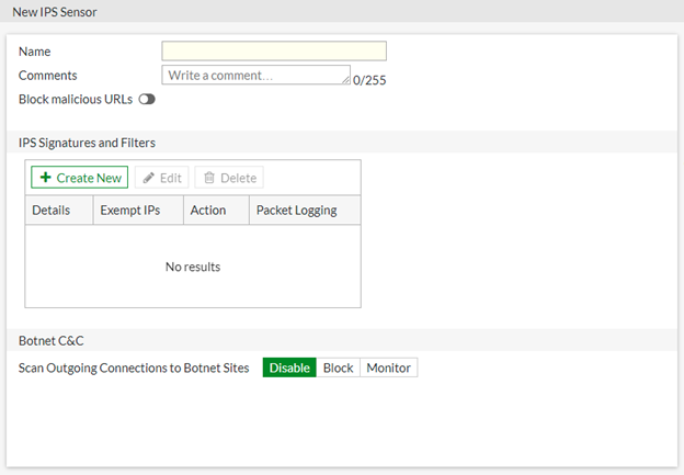To view IPS sensors, go to Security Profiles > Intrusion Prevention. To create a new sensor, click Create New.