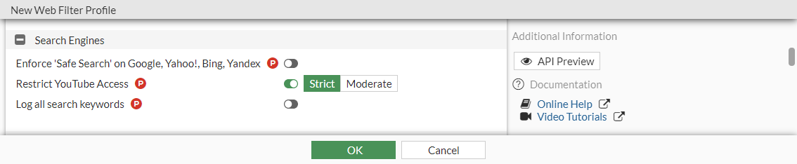 - In the Search Engines section, enable Restrict YouTube Access and select either Strict or Moderate.