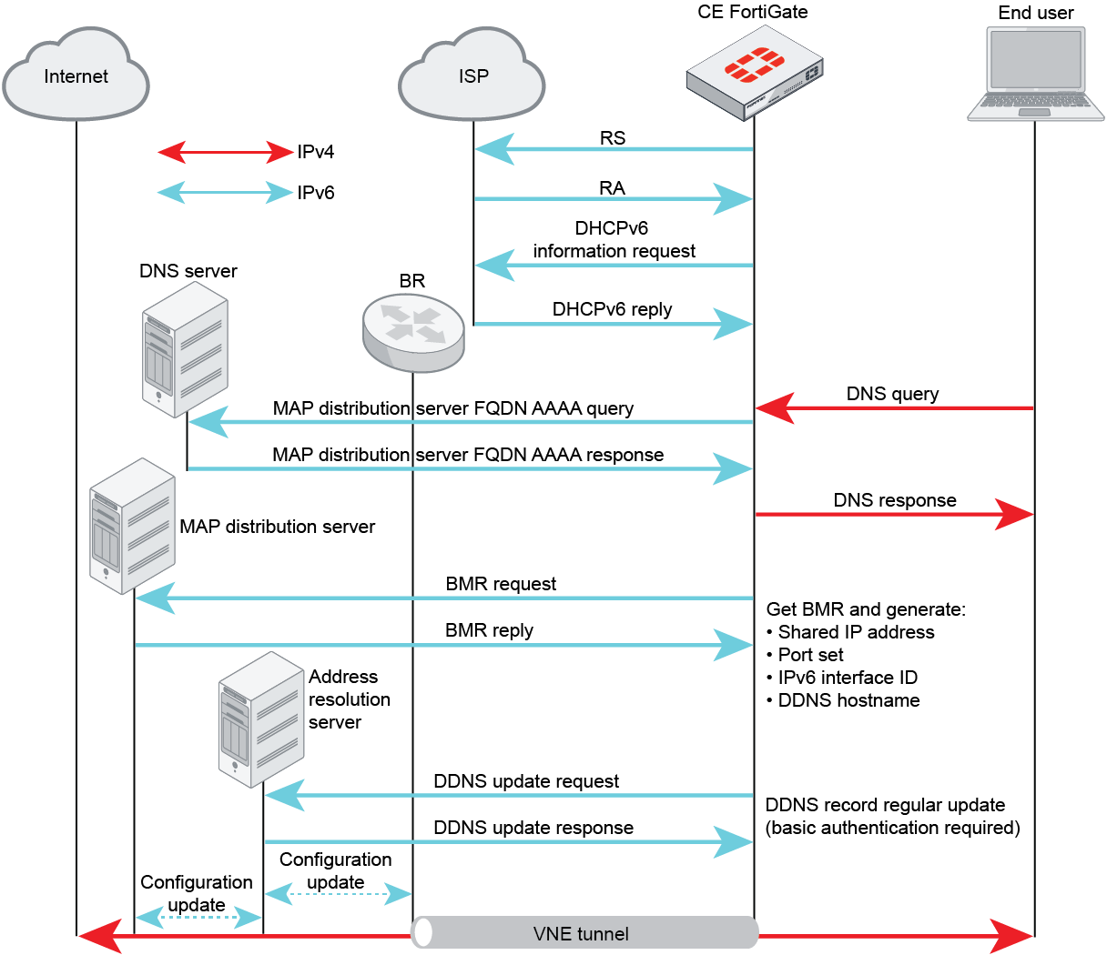The FortiGate sends a MAP rule request to the MAP distribution server once the IPv6 address is configured on the FortiGate by RS/RA. Next, the FortiGate will send an AAAA query to get the IPv6 address of the MAP distribution server. After sending the BMR request to the MAP distribution server, the FortiGate will get the IPv4 address, port set, BR IPv6 address, and hostname of the address resolution server from the BMR reply. The VNE tunnel between the FortiGate and BR is now established.