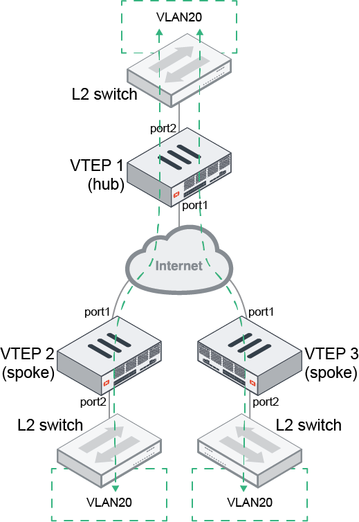 In this topology, an IPsec VPN hub and spoke overlay network is already configured between sites. To allow networks behind the hub and spokes to be connected together, each spoke has a VXLAN connection to the hub, and the hub allows interconnection between its private network and each of the VXLAN interfaces to the spokes. In this scenario, the private networks behind each spoke are actually on the same L2 network as the private network behind the hub.