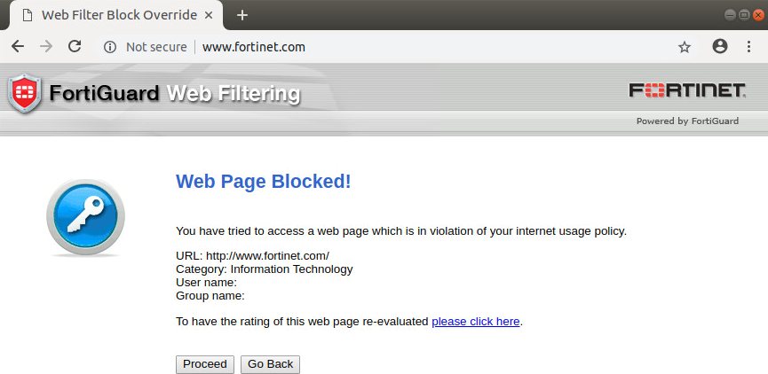 - Go to a website that belongs to the blocked category, such as www.fortinet.com.