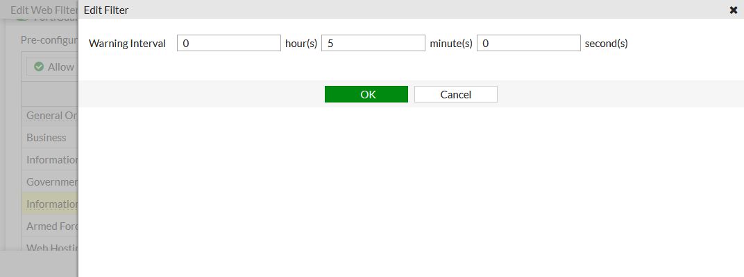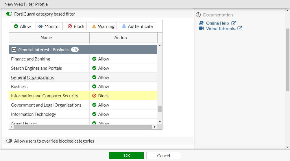 - In the FortiGuard category based filter section, select Information and Computer Security, then click Warning.