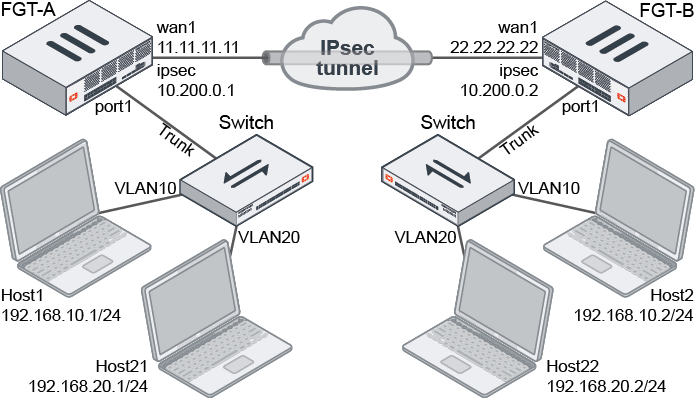 In this example, a site-to-site VPN tunnel is formed between two FortiGates. A VXLAN is configured over the IPsec interface. Multiple VLANs are connected to a switch behind each FortiGate. Host1 and Host2 are connected to VLAN10 on the switches on each site, and Host21 and Host22 are connected to VLAN20. Using virtual wire pairs, the internal interface (port1) will be paired with the VXLAN interface (vxlan) to allow VLAN traffic to pass through in either direction.