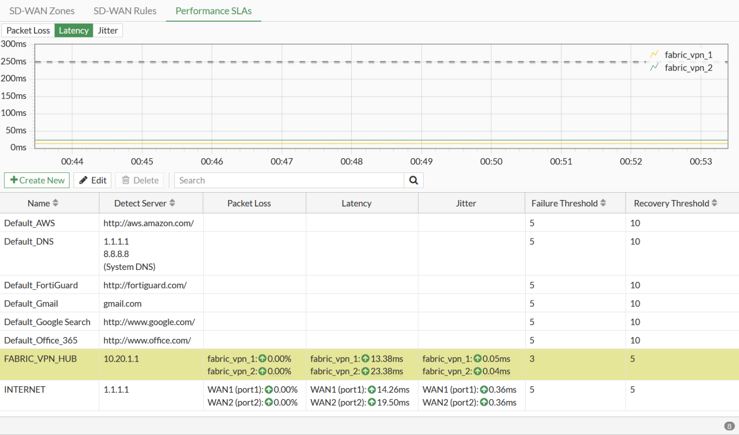 - Verify that the performance SLA is automatically created for the hub FortiGate. There is a new entry (FABRIC_VPN_HUB).