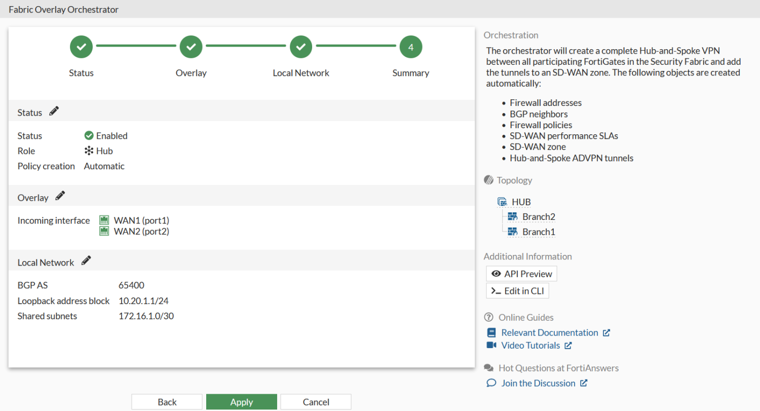 The following steps should be used to configure a self-orchestrated SD-WAN overlay within a single Security Fabric. These steps must be followed in order, and assume that the prerequisites and network topology are in place.