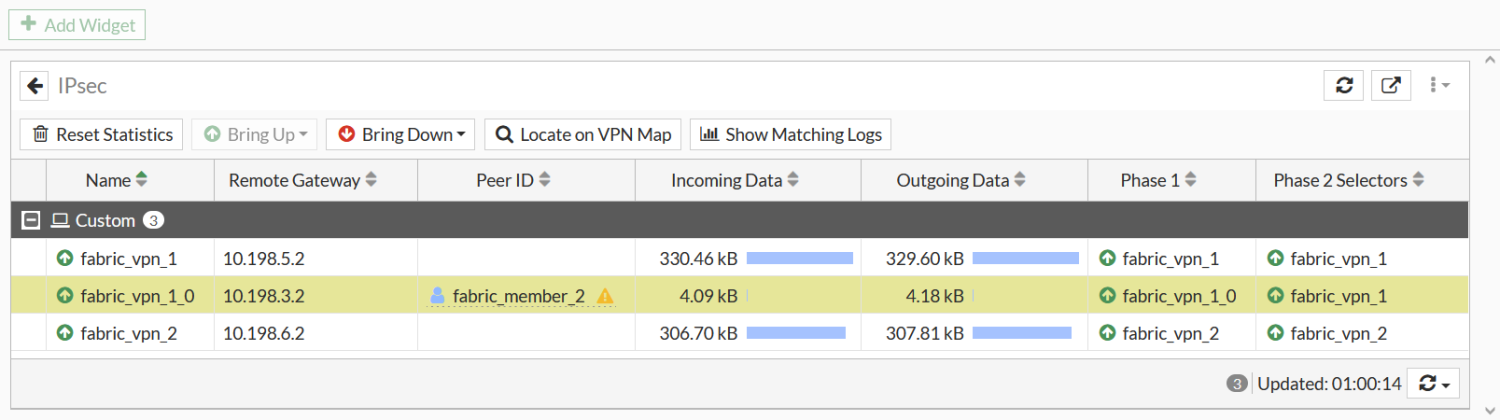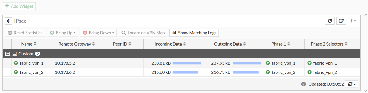 fabric_vpn_1_0tunnel was created for spoke 1-to-spoke 2 communication.In the GUI, go to Dashboard > Network and click the IPsec widget to expand it.