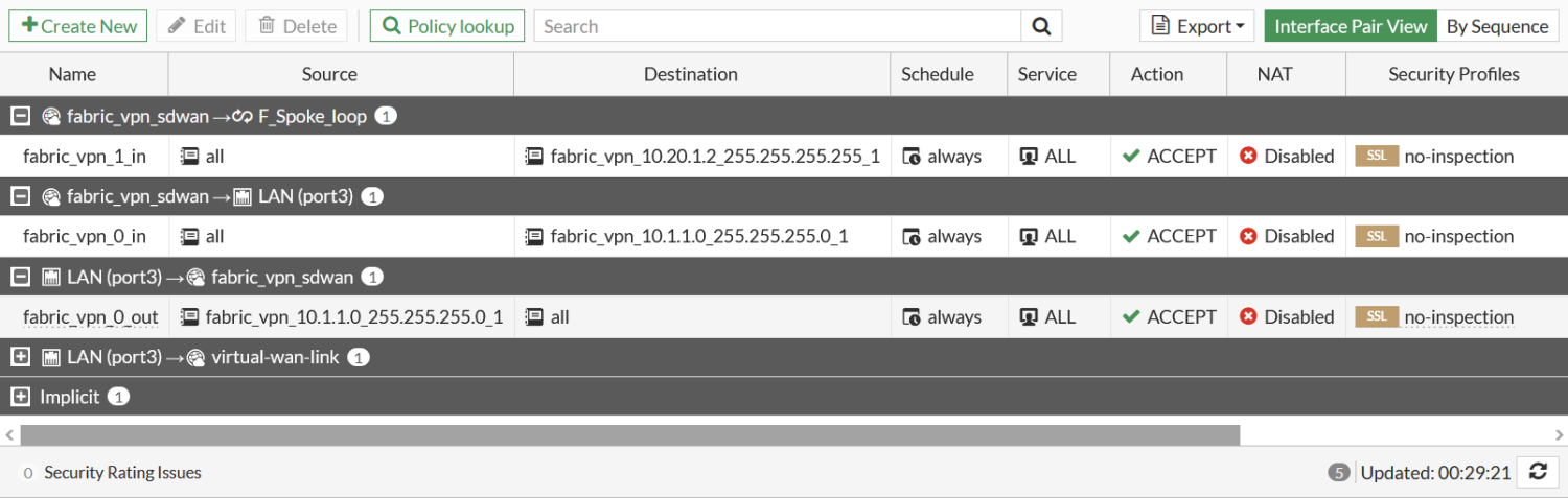If the hub's Policy creationsetting is Manual, there should be no new policies created by the Fabric Overlay Orchestrator. If desired, firewall policies must be manually configured on the spoke FortiGates to allow traffic to the loopback interface for health checks and the overlays.