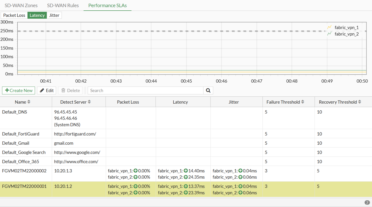 - Verify that the performance SLAs are automatically created for each spoke. The performance SLA naming uses the serial number of the spoke FortiGate. There are two new entries.