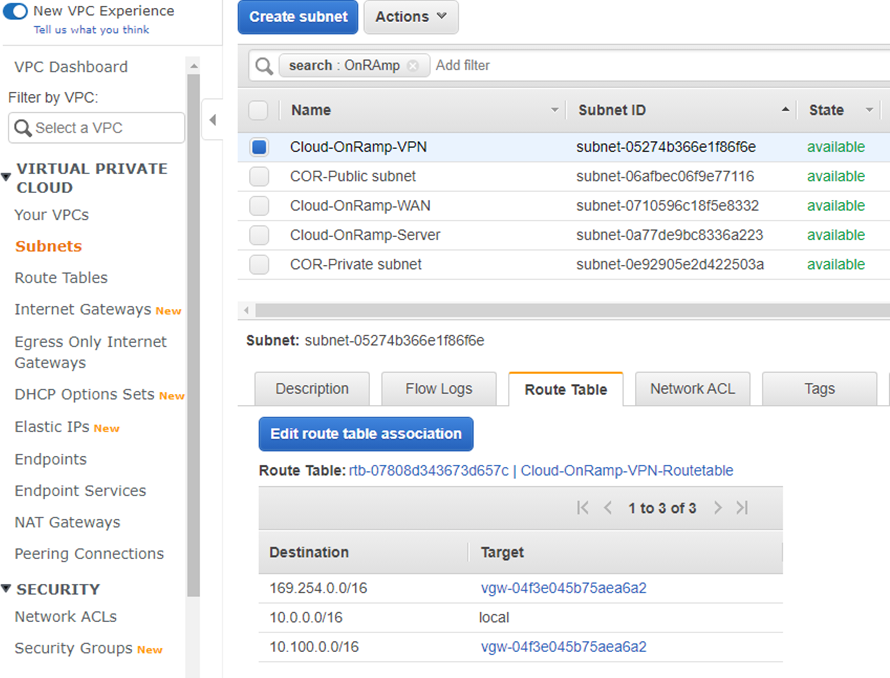 - The new VPG is attached to your VPC, but to successfully route traffic to the VPG, proper routing must be defined. Go to Virtual Private Cloud > Subnets, select the Cloud-OnRamp-VPN, and select the Route Table tab to verify that there are at least two routes to send traffic over the VPG.
