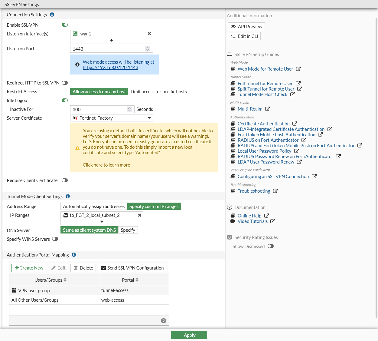 It is HIGHLY recommended that you acquire a signed certificate for your installation. Please review the SSL VPN best practices and learn how to Procuring and importing a signed SSL certificate.