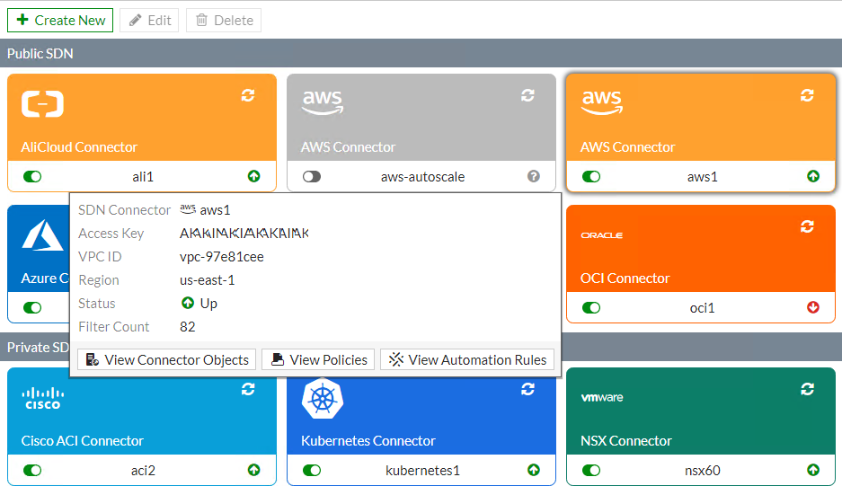 The following provides general instructions for creating an SDN connector and using the dynamic address object in a firewall policy. For instructions for specific public and private cloud solutions, see the relevant topic in this guide. For advanced scenarios regarding SDN connectors, see the appropriate FortiOS 7.2 cloud platform guide.