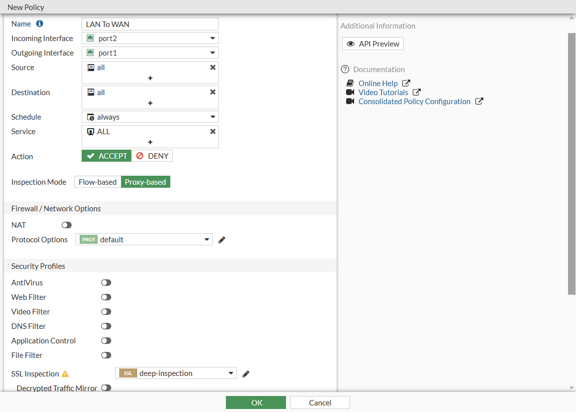 This example creates a basic policy. If required, security profiles can be enabled, and deep SSL inspection can be selected to inspect HTTPS traffic.