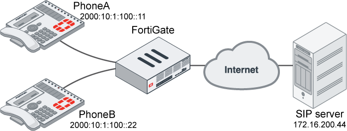 In this example, SIP phones on the internal network use IPv4, and the SIP server on an external network uses IPv6. NAT46 is used with SIP ALG to allow for seamless communication. A VoIP profile, sip, has already been created.