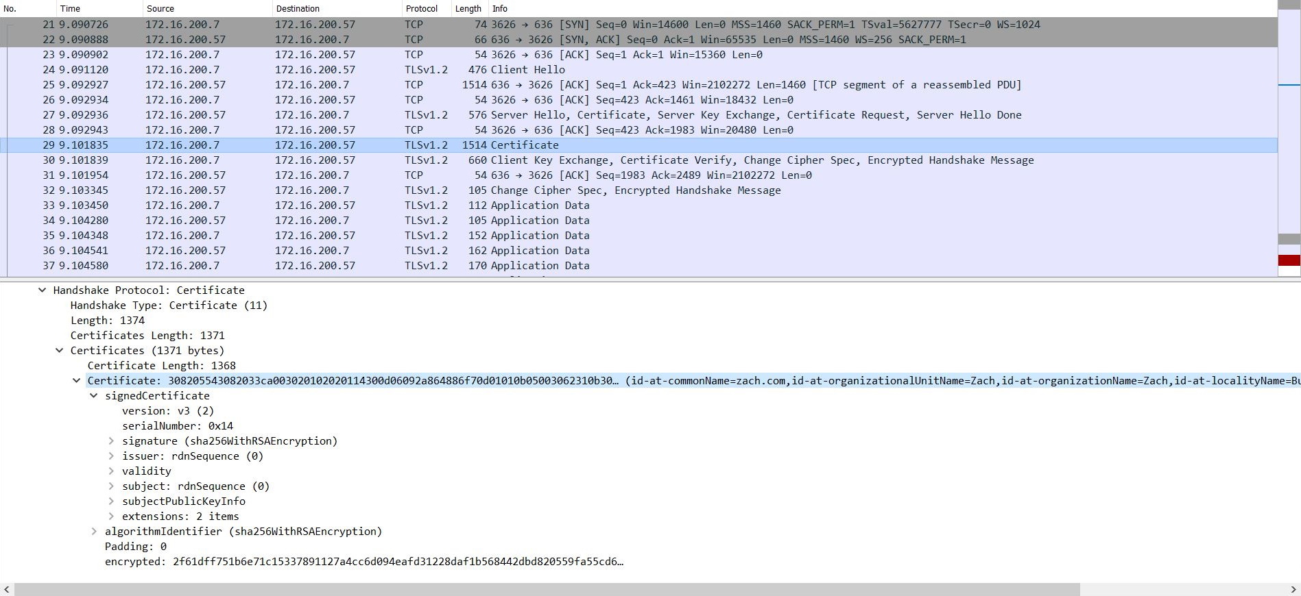 When traffic from the endpoint PC matches a policy and triggers authentication, the FortiGate starts the LDAPS TLS connection handshake with the Windows AD. The LDAPS server requests a client certificate to identify the FortiGate as a client. The FortiGate provides a configured client certificate, issued to zach.com, to the LDAPS server.