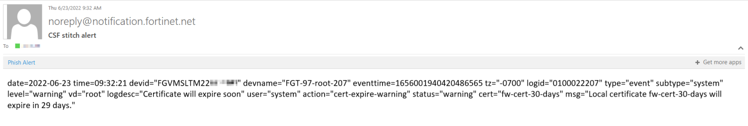 Once the event log is generated for the local certificate expiry, the automation stitch is triggered end the email notification is sent.